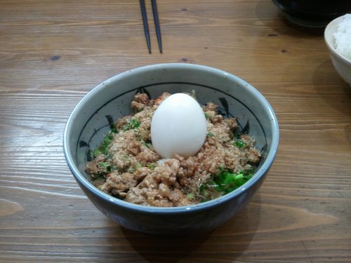 刻んだネギをかけて、魚粉を結構かけて、豚ミンチをかけて、刻みにんにくもちょっとのっけて、本当は卵黄をのせたかったんですが昨日のポテトサラダに使ったゆで卵の残りがあったのでのっけてみました。