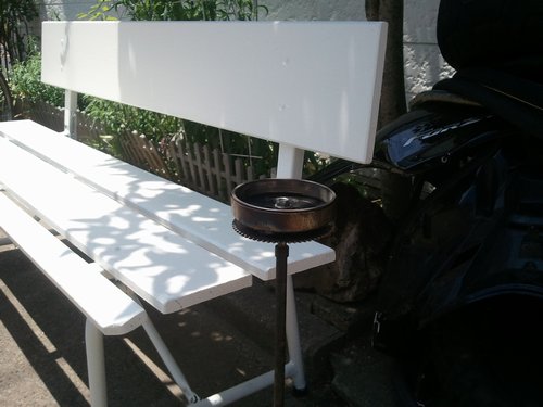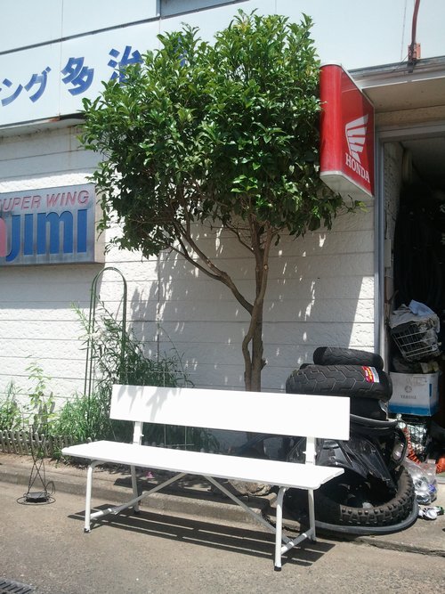 修理を待ってられる方、おしゃべりされる方、休憩される方、本を読まれる方、いろんな方に愛されるベンチになって欲しいと思います。